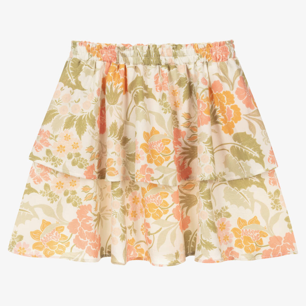 A lovely ivory skirt for girls from The New Society, with a beautiful tropical floral print in green and coral pink. A flattering silhouette, this full skirt is made in tiered layers of soft and lightweight silky crêpe for a truly feminine look. The waist is softly elasticated for a comfortable fit.