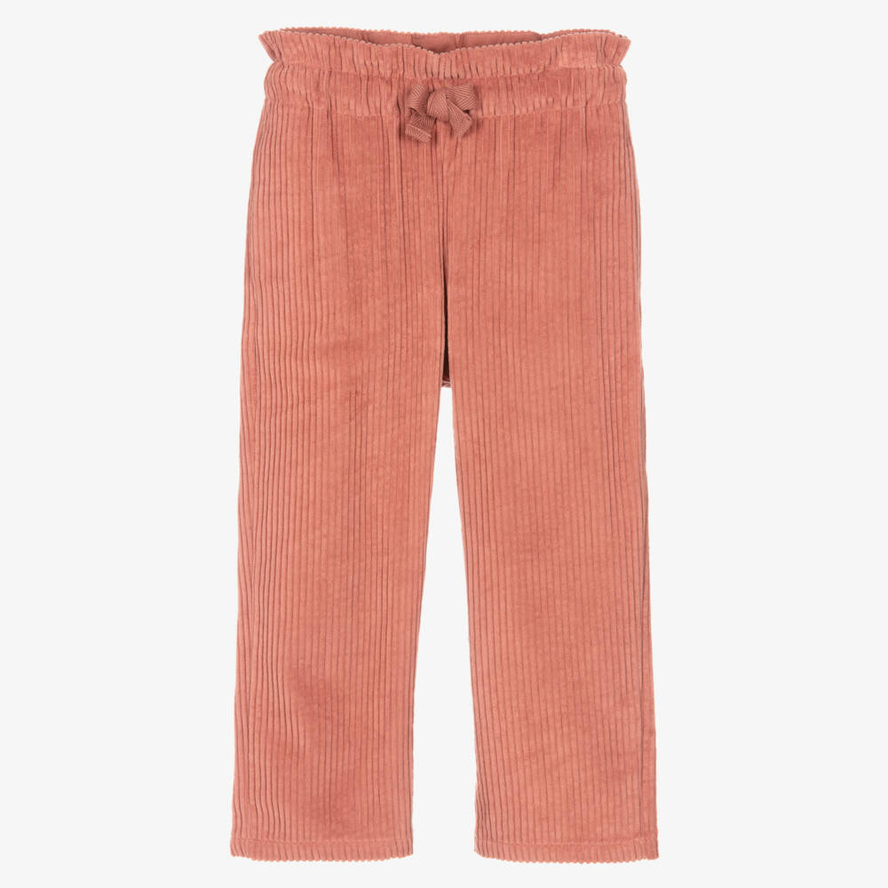Terracotta pink trousers for girls by The New Society, made in super soft cotton jumbo corduroy. This easy-to-wear straight-leg style has an elasticated waistband with a drawstring tie for a comfortable fit and useful concealed side pockets.