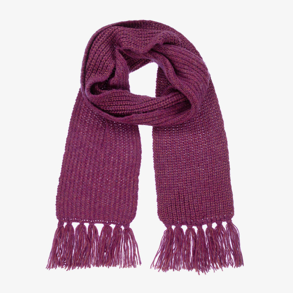 Beautifully soft purple scarf for girls by The New Society, in a chunky ribbed knit with a touch of wool for cosy wear. This fluffy style is knitted with golden thread for a glamorous touch and has lovely tassel trims.
