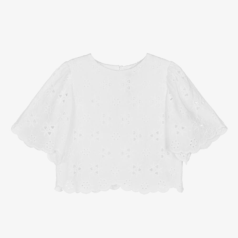 Lovely white broderie anglaise blouse for girls by The New Society. Ideal for warm days, it is made in lightweight cotton, with prettily puffed, short sleeves that have scalloped edges to match the scalloped hemline. It is lined in cotton voile for comfort and has a mother-of-pearl, keyhole button fastening around the back.