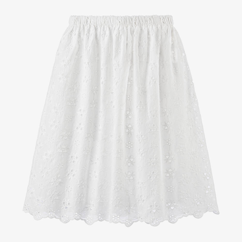 Lovely white broderie anglaise skirt for girls by The New Society, made in lightweight cotton and ideal for warm days. With a comfortable, elasticated waistband, it has a pretty, scalloped hemline and is lined in cotton voile. Easy to wear, it simply pulls up.