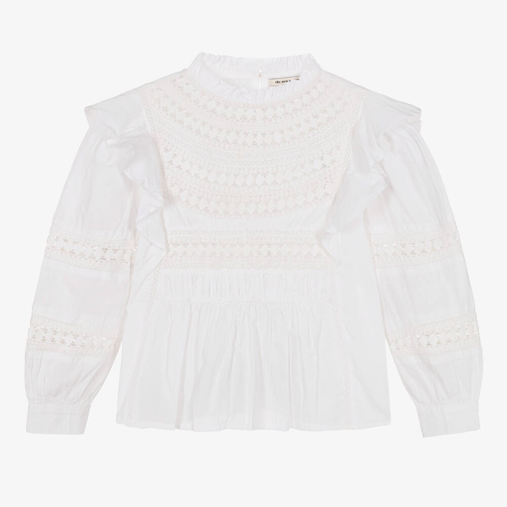 Beautiful white cotton blouse for girls by Spanish brand, The New Society. Soft and lightweight, it has exquisite lace trim on the bodice and sleeves and pretty ruffle detail. There is a stylish keyhole button fastening on the back and the blouse has button-fastening cuffs.