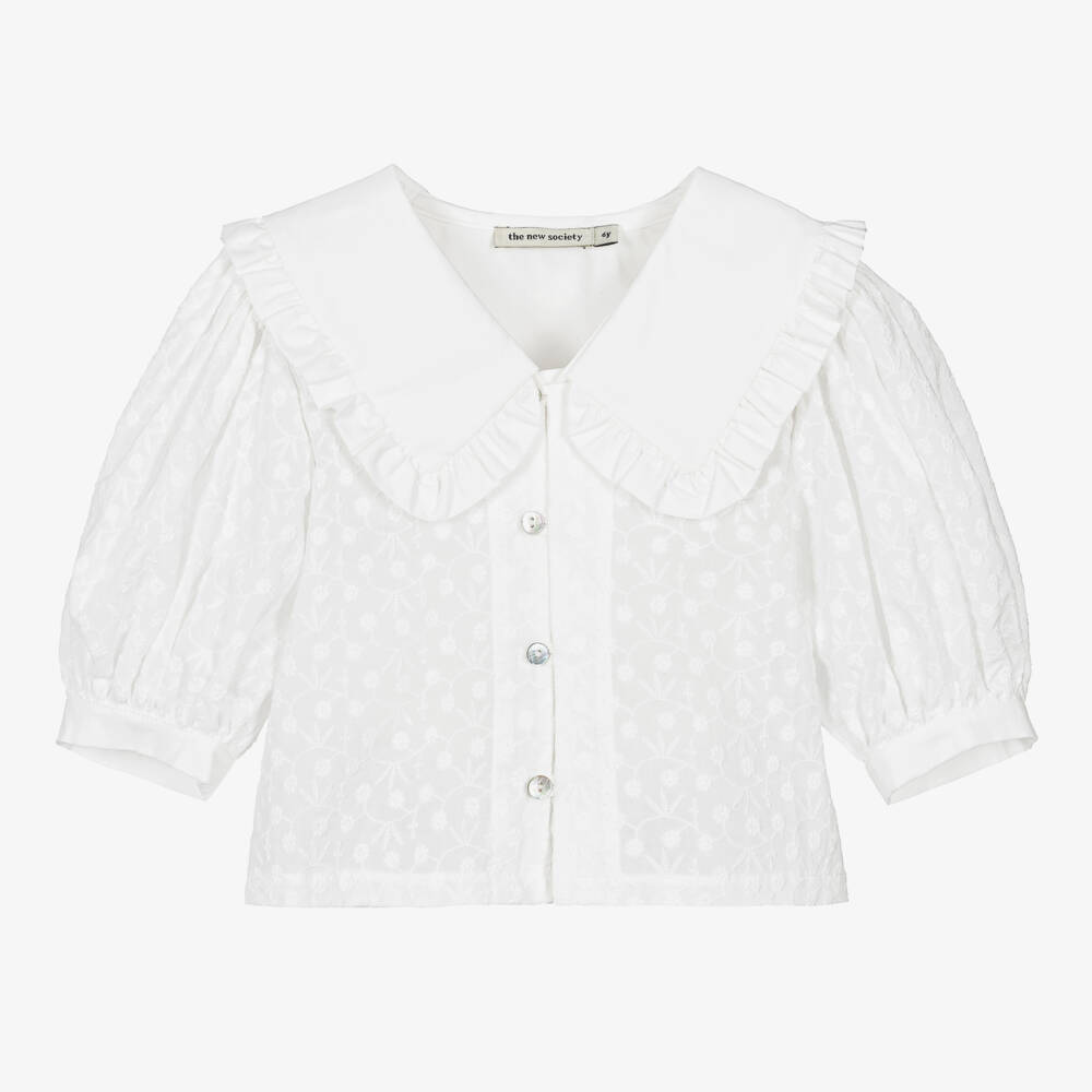 This gorgeous white blouse from The New Society is for girls. Slightly cropped in length, it is woven in beautifully soft and lightweight cotton voile, and intricately embroidered with delicate tone-on-tone flowers across the front and sleeves. The ruffle-trimmed collar, romantic puffed sleeves and mother-of-pearl front buttons add touches of vintage-style elegance to this lovely piece.