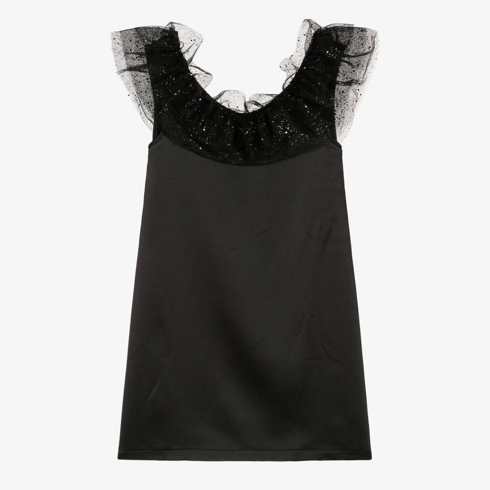 Pretty black satin dress for girls by The Tiny Universe, with a statement tulle ruffle around the neckline, embellished with sequins. Soft and silky, the A-line shape and low back allows it to slip on easily over the head. Finished with a small black designer logo patch on the back, this lovely dress is ideal for a special occasion.