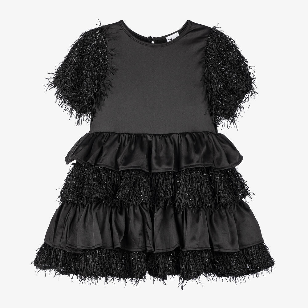 Gorgeous black satin dress for girls by Swedish brand The Tiny Universe, ideal for any special occasion. It has short, feathery tulle sleeves that shimmer with shiny thread, and matching, gathered tiers on the satin-lined skirt. There is a keyhole button fastening on the back, with a logo tab below for instant brand recognition.