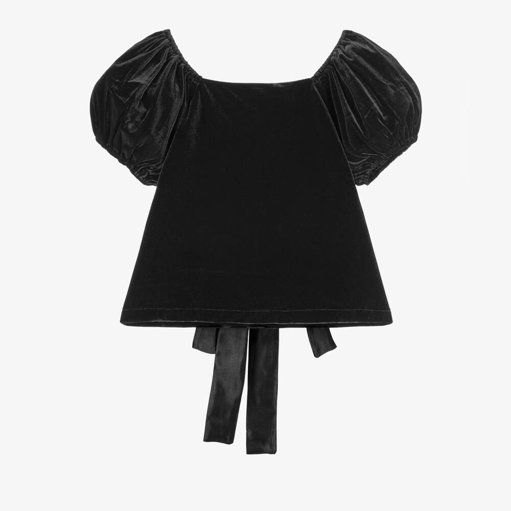 Smart black blouse for girls by Swedish brand The Tiny Universe, just right for parties and special occasions. Super soft and comfortable, it is made in slightly stretchy velour, and has prettily puffed, short sleeves with gently elasticated cuffs. It has lovely satin ties on the back that fasten in large, eye-catching bows. There is a logo tab above the ties for brand recognition and a soft satin lining for comfort.