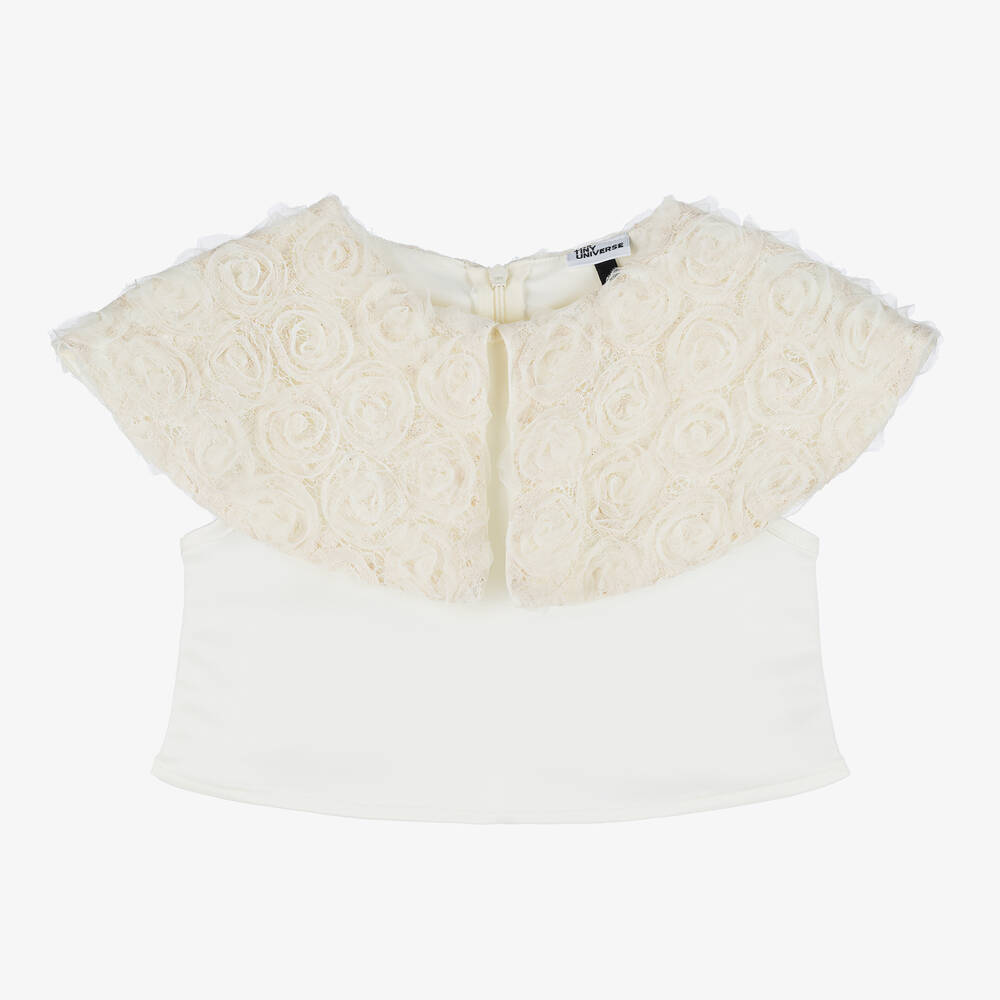 Smart and stylish, an ivory satin special occasion top for girls by Swedish brand The Tiny Universe. This sleeveless style has a large lace collar embellished with tulle floral appliqués, and a yellow logo tab around the back. Soft and silky, it has a concealed zip fastening for a neat finish.
