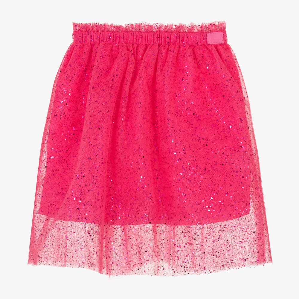 Neon pink tulle skirt by The Tiny Universe for girls. Covered in glittery sparkles, this multi-layered design has a mesh underskirt and a satin lining for comfort. The waistband is stretchy and elasticated for fit.