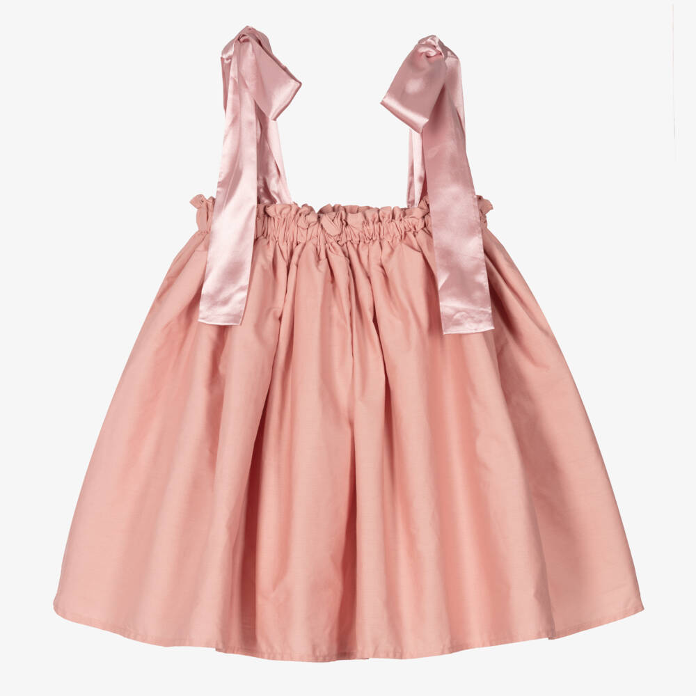A dramatic dusky pink dress for girls by Swedish brand The Tiny Universe, made and lined in soft cotton poplin, with a tulle attachment for volume. This easy-to-wear style has a super stretchy elasticated hem and delicate satin tie shoulder straps.