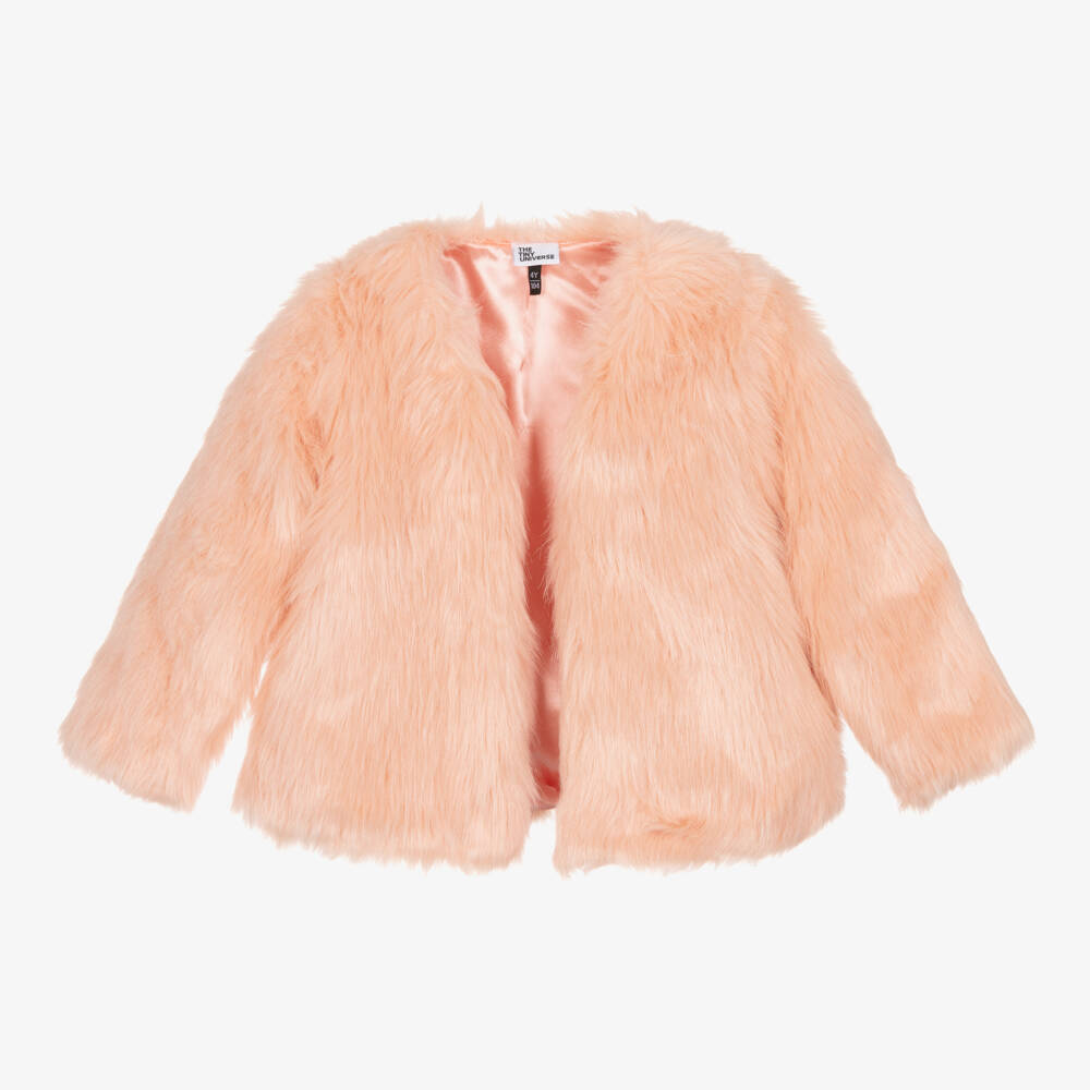 A fun pink jacket for girls by Swedish brand The Tiny Universe, made in soft faux fur. Stylish and comfortable, this fluffy style has a silky satin lining and an open front. A tonal logo patch can be seen on the back of the neckline.