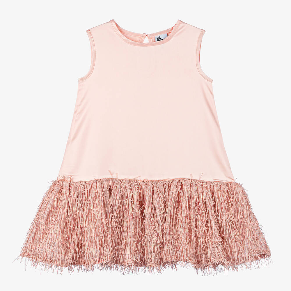 Fun pink special occasion or party dress for girls by Swedish brand The Tiny Universe, made in soft satin. It has a feathery, drop-waisted tulle skirt that shimmers with shiny thread, has a mesh underskirt for volume and is lined in satin for comfort. There is a keyhole button fastening around the back.