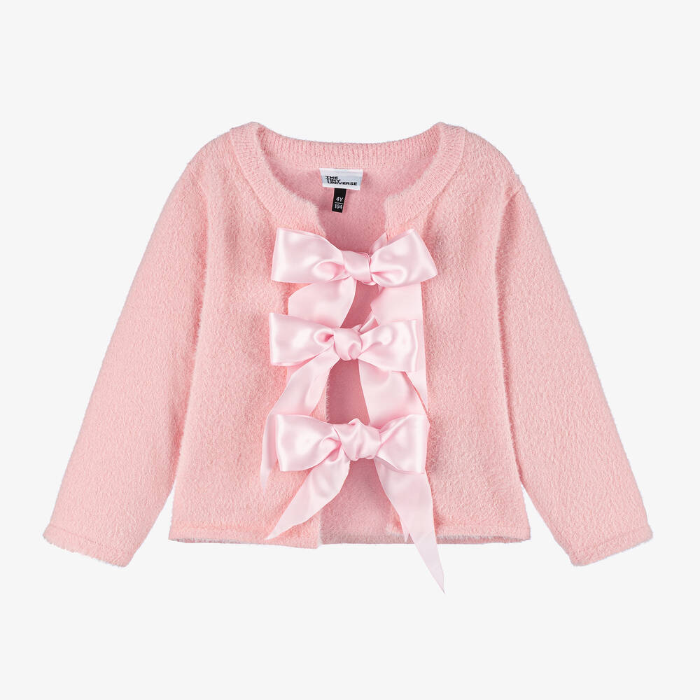 Lovely pink cardigan for girls by Swedish brand The Tiny Universe, made in a soft knit. Ideal for layering, this pretty cardigan has a ribbed collar and large pink satin ribbons at the front to tie into bows.