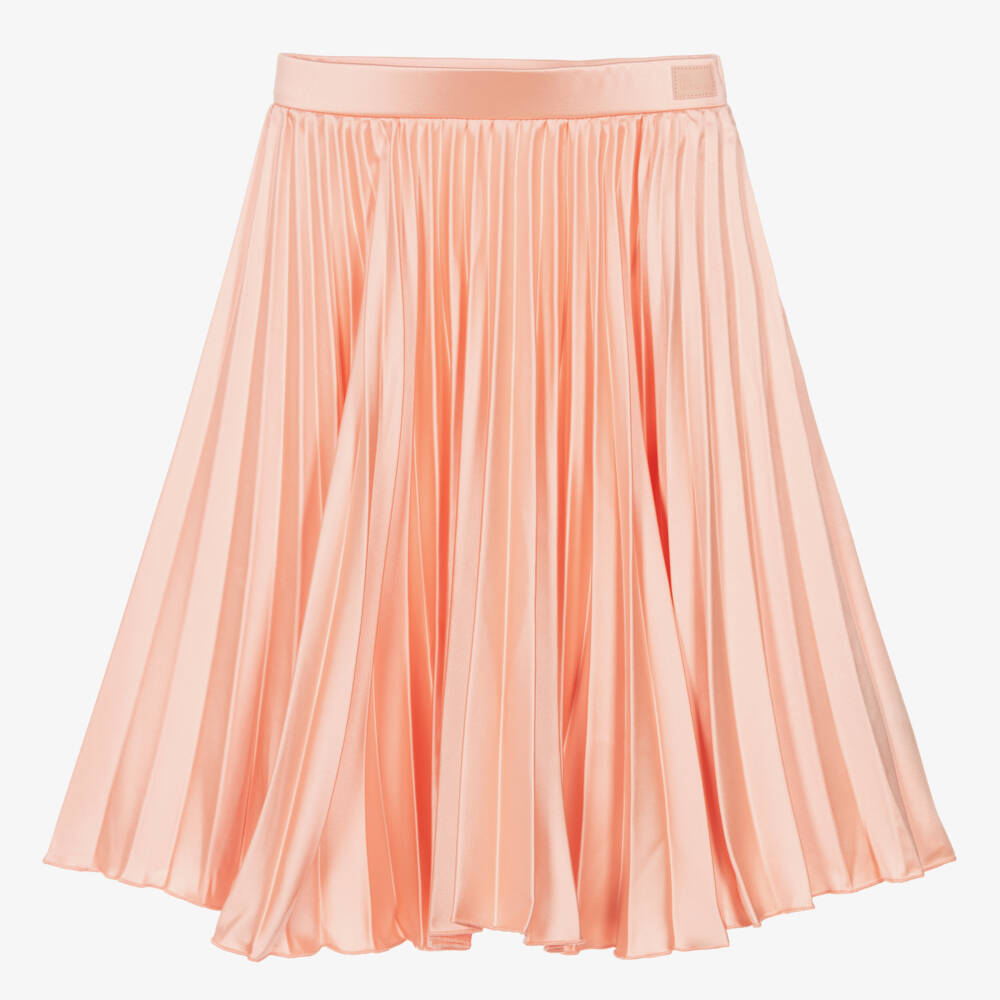 Pretty pink pleated skirt for girls by The Tiny Universe, made in a soft and glossy satin. Timeless and versatile, it has a subtle designer logo patch on the waistband and a side zip fastening for a flawless fit.