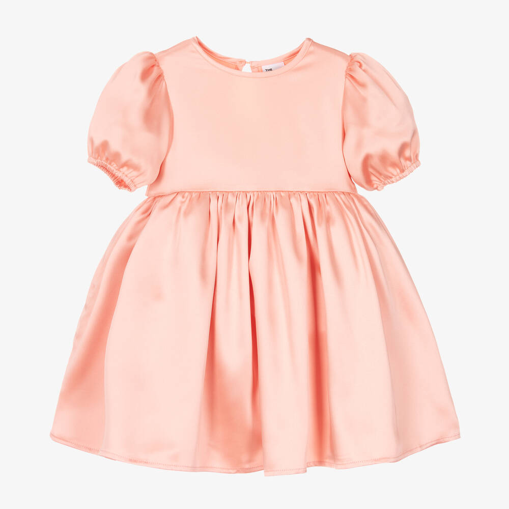 Pretty pale pink dress for girls by The Tiny Universe, made in sumptuous satin. The full gathered skirt has an additional tulle underlayer for extra volume, and the charming, puffed sleeves have gently elasticated cuffs for extra comfort. At the back there is a keyhole button fastening, a long sash that ties into a statement bow, and the designer's logo badge.