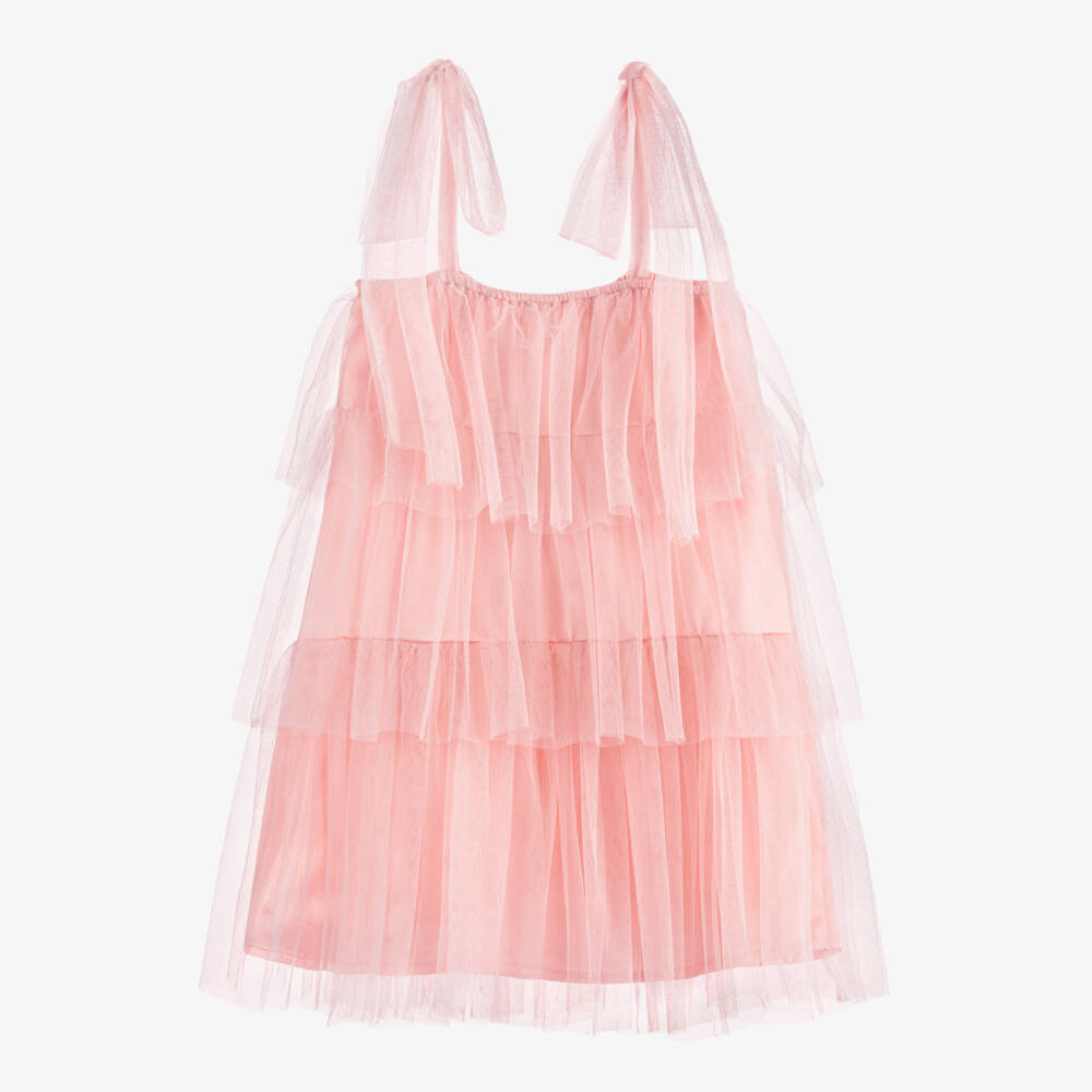 A beautiful pink dress for girls by The Tiny Universe. This tiered dress is made in layers of soft tulle with silky soft satin lining underneath and a logo patch on the back. Lovely for both a special occasion and casual wear, it has soft tulle shoulder straps to tie into a bow, adding a pretty finishing touch.