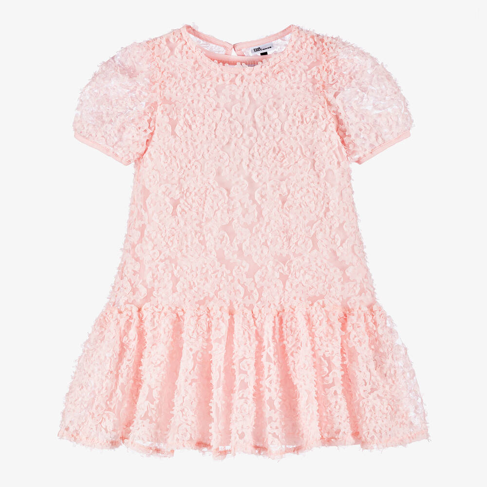 Eye-catching pale pink tulle dress for girls by The Tiny Universe, covered in wavy pink chiffon appliqués. It has pretty puffed sleeves and a deep ruffle around the hemline. It comes with a separate, sleeveless jersey shift dress to wear either below or separately.