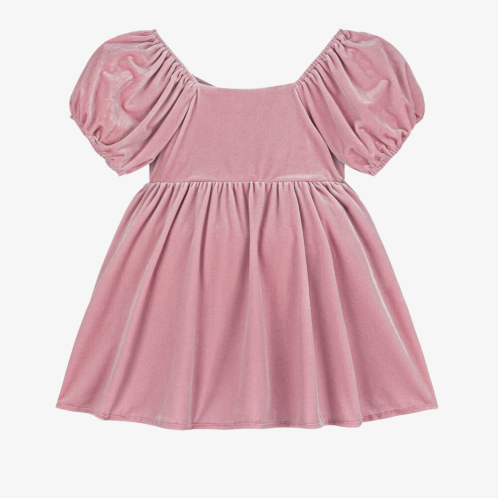 Gorgeous pink dress for girls by The Tiny Universe, made in soft and lustrous velour with a silky satin lining. Lovely for a special occasion, the charming silhouette features puffed sleeves, gently elasticated for comfort, and a gathered skirt with a tulle underlayer. The dress fastens on the back with satin ribbons that can be tied into statement bows, alongside the brand's logo tab for a discreet designer touch.