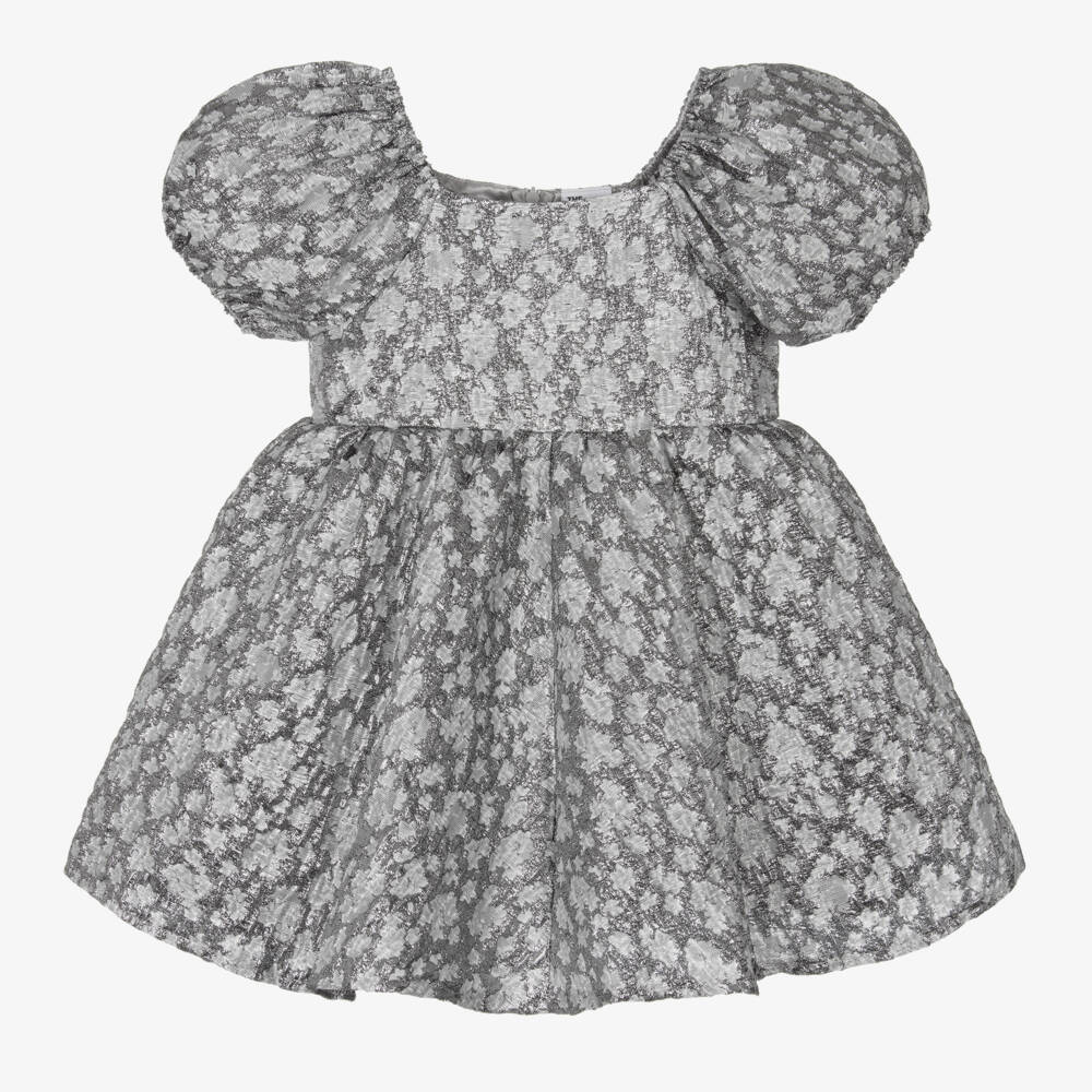 Dazzling silver dress for girls by The Tiny Universe, with a lined, gathered skirt that has an additional tulle trim for extra volume. Made from a sparkly floral jacquard material, this dress has a structured silhouette with gently elasticated puffed sleeves. There is a concealed zip fastening on the back with a black designer logo patch, for an added branded touch.