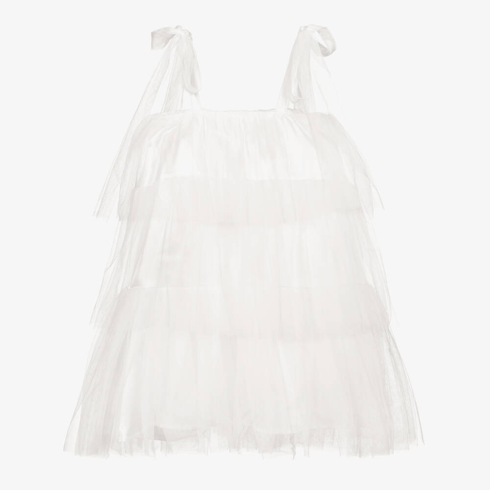 A beautiful white special occasion dress for girls by The Tiny Universe. This tiered dress is made in layers of soft tulle with silky soft satin lining underneath. It has soft tulle shoulder straps to tie into a bow and a logo patch on the back.