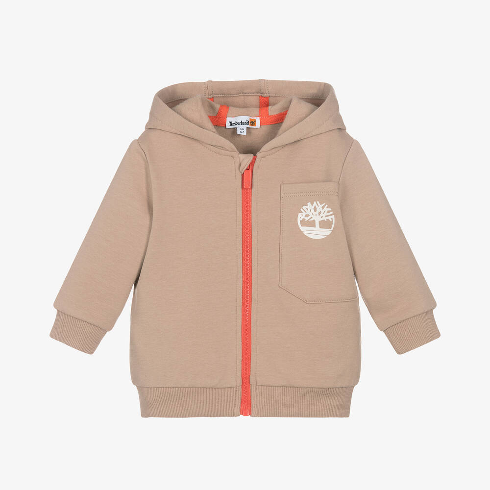 Beige organic cotton zip-up hooded top for baby boys by American brand Timberland, just right for relaxed days. Made in soft jersey with a brushed feel inside for cosy comfort, it has neat, ribbed trims and a slightly off-centre patch pocket on one side, printed with the label's signature tree logo in white. The exposed, bright orange zip fastening on the front has a useful, protective, chin guard.