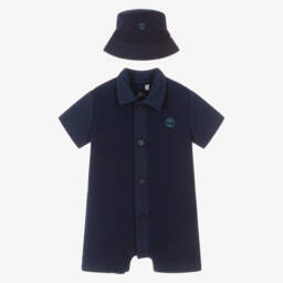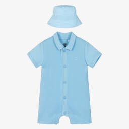 Cute bright blue babysuit set for boys by Timberland, made in soft cotton jersey with matching iconic tree logo prints. The polo-style shortie has a patch pocket and branded poppers on the front with further ones between the legs to help with nappy changing. The bucket hat is lined for comfort with overstitch detailing on the brim.