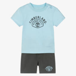 Pale blue snowsuit for baby boys by American brand Timberland, with a warm, ivory fleece lining and navy blue trims. Water repellent and gently padded, this cosy hooded snowsuit has double zip fastenings on the front, with protective chin guards at the top. For an extra snug feel, matching mittens and booties secure with poppers. A logo is stamped on the velcro fastening front pocket and the brand's signature tree logo is printed on one sleeve. This product contains at least 70% recycled material.