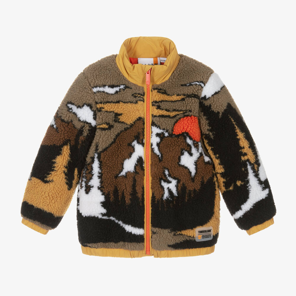Brown zip-up top for baby boys by American brand Timberland, with a yellow, white and orange mountain print and a rubberised logo badge on the front. Ideal for chilly weather, it is made in cosy fleece, with a stand-up collar, elasticated cuffs on the long sleeves and a matching hemline for extra cosiness. Concealed side pockets keep little hands warm, whilst the orange zip fastening on the front has a branded pull tab and a protective chin guard. There is an orange cotton jersey lining for comfort.
