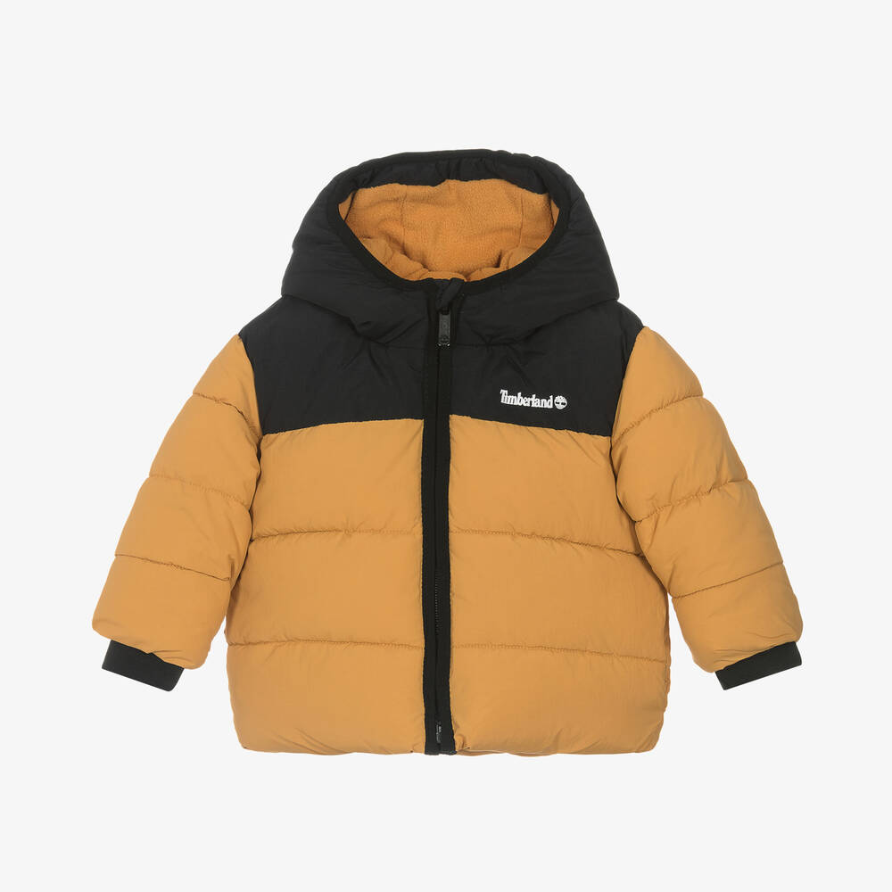Ochre yellow puffer jacket for baby boys by Timberland, stamped with the signature tree logo on the chest in white. It has a water repellent coating and soft, warm padding, making it ideal for cold, rainy days. The hood and front pockets are lined in fleece for extra cosiness. It fastens smoothly with a branded black zip on the front. This item contains a minimum of 70% recycled material.