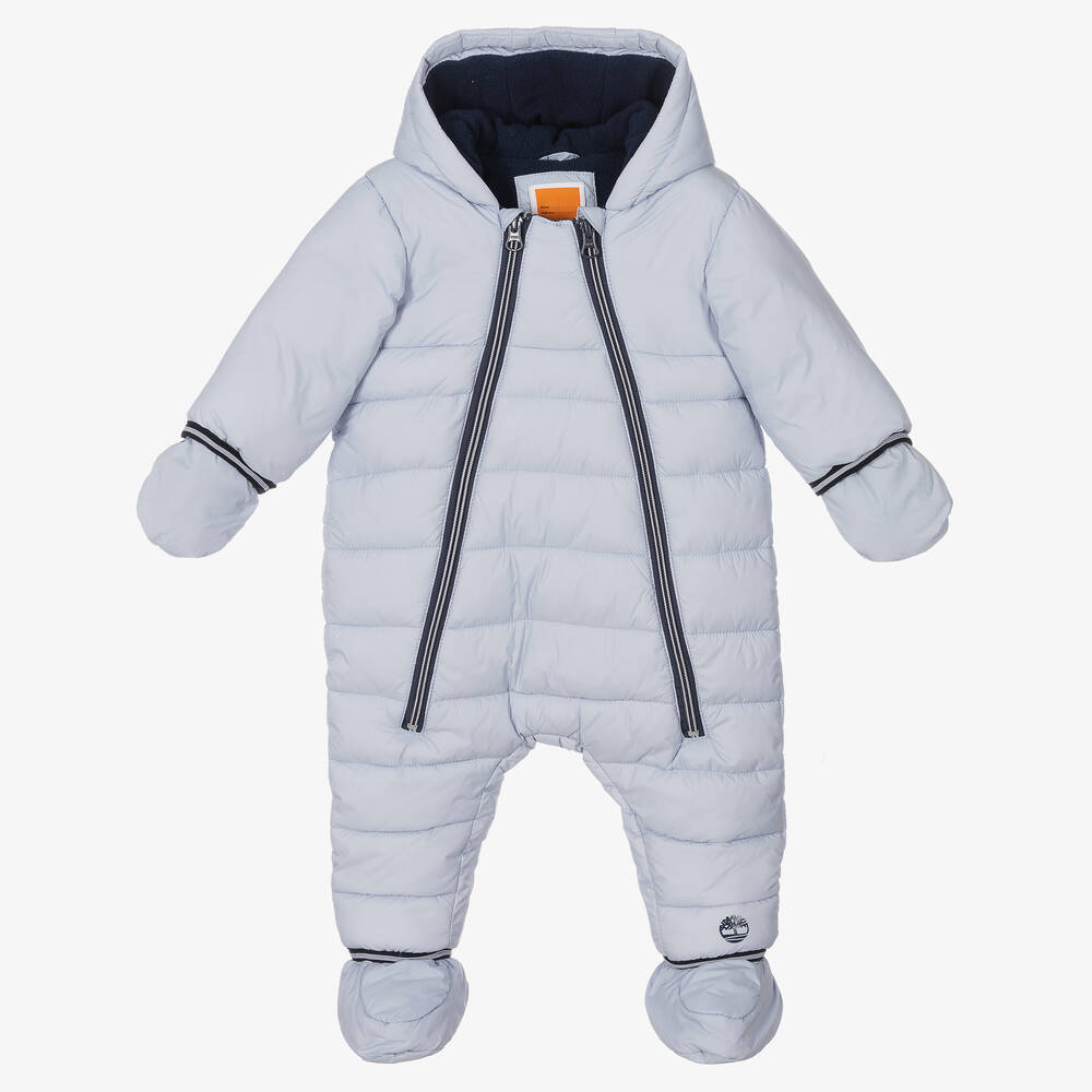 Baby boys pale blue snowsuit by Timberland, with navy blue and white double front zip fastenings. Water repellent and smooth, it has warm padding with soft and cosy blue polar fleece lining. It has a dark blue logo print on one leg and on the base of the sole printed booties. It comes with mittens and booties, detachable with poppers.