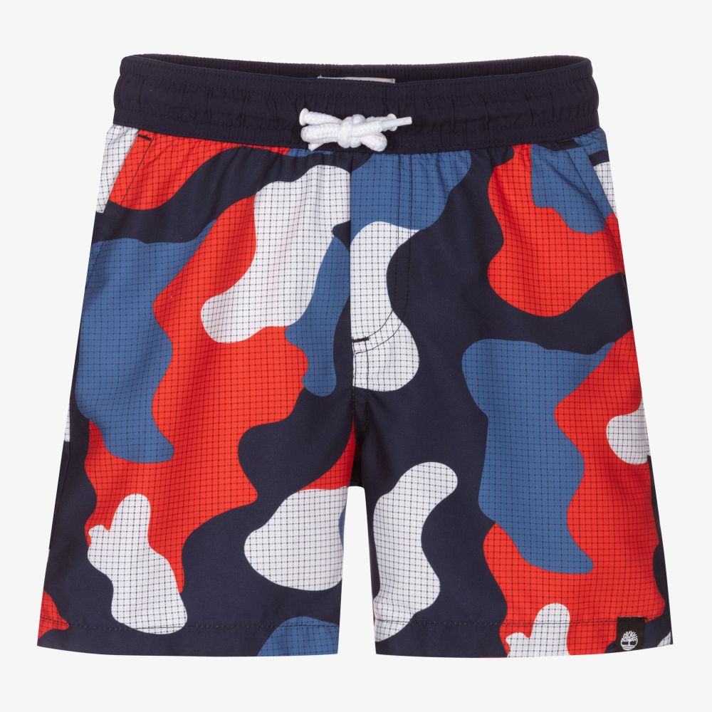 Navy blue and red swim shorts for boys, by Timberland. Made from smooth polyester with a lightweight mesh lining, they have a cool blue and red camouflage pattern all-over, with the brand's iconic tree logo tab on the hem.
