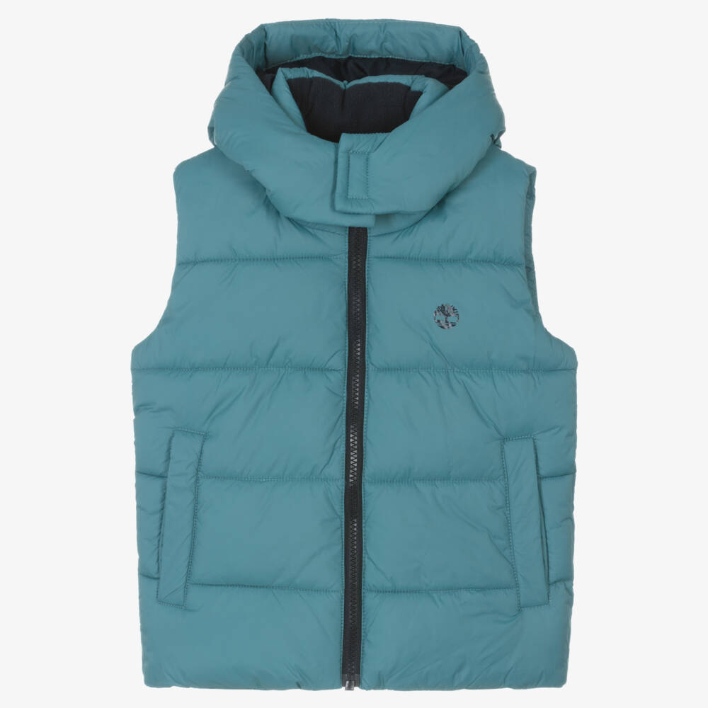 Silky aqua blue puffer gilet for boys by American brand Timberland, ideal for cooler days, as well as for layering beneath a jacket or coat. Water repellent and softly padded for comfort and warmth, it has a cosy hood secured with velcro under the chin and fleece-lined front pockets to keep little hands toasty. It fastens with an exposed, navy blue zip that has a useful, protective chin guard. The iconic tree logo is printed on the chest in navy blue and there is a navy blue, logo-branded satin lining. This product contains a majority of recycled polyamide.