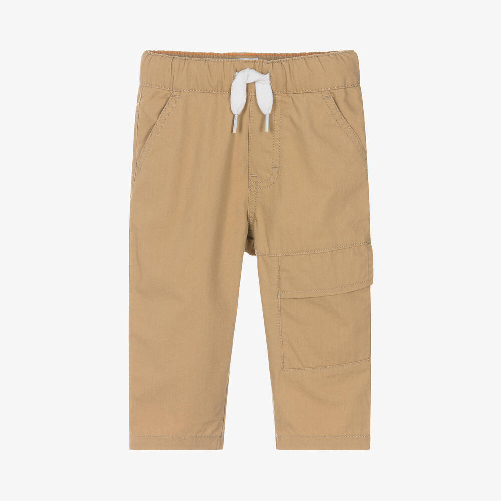 Cool and casual khaki beige cotton trousers for little boys by Timberland. They simply pull on with a drawstring at the waist for an adjustable fit. There are slanted front pockets, a cargo-style pocket on one leg and a black logo patch on the back for added designer flair.