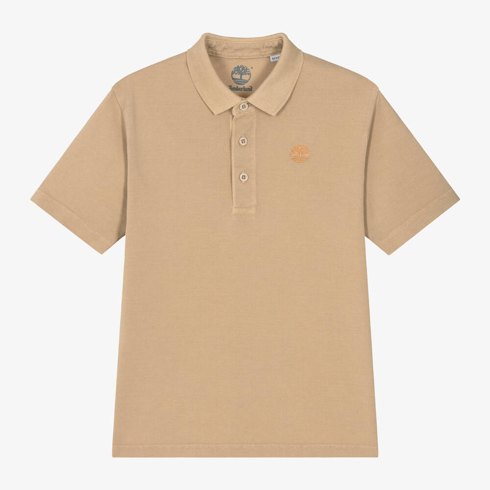 Beige piqué polo shirt for boys by Timberland, made in soft organic cotton. The embroidered iconic tree logo and branded button fastenings add a signature touch.