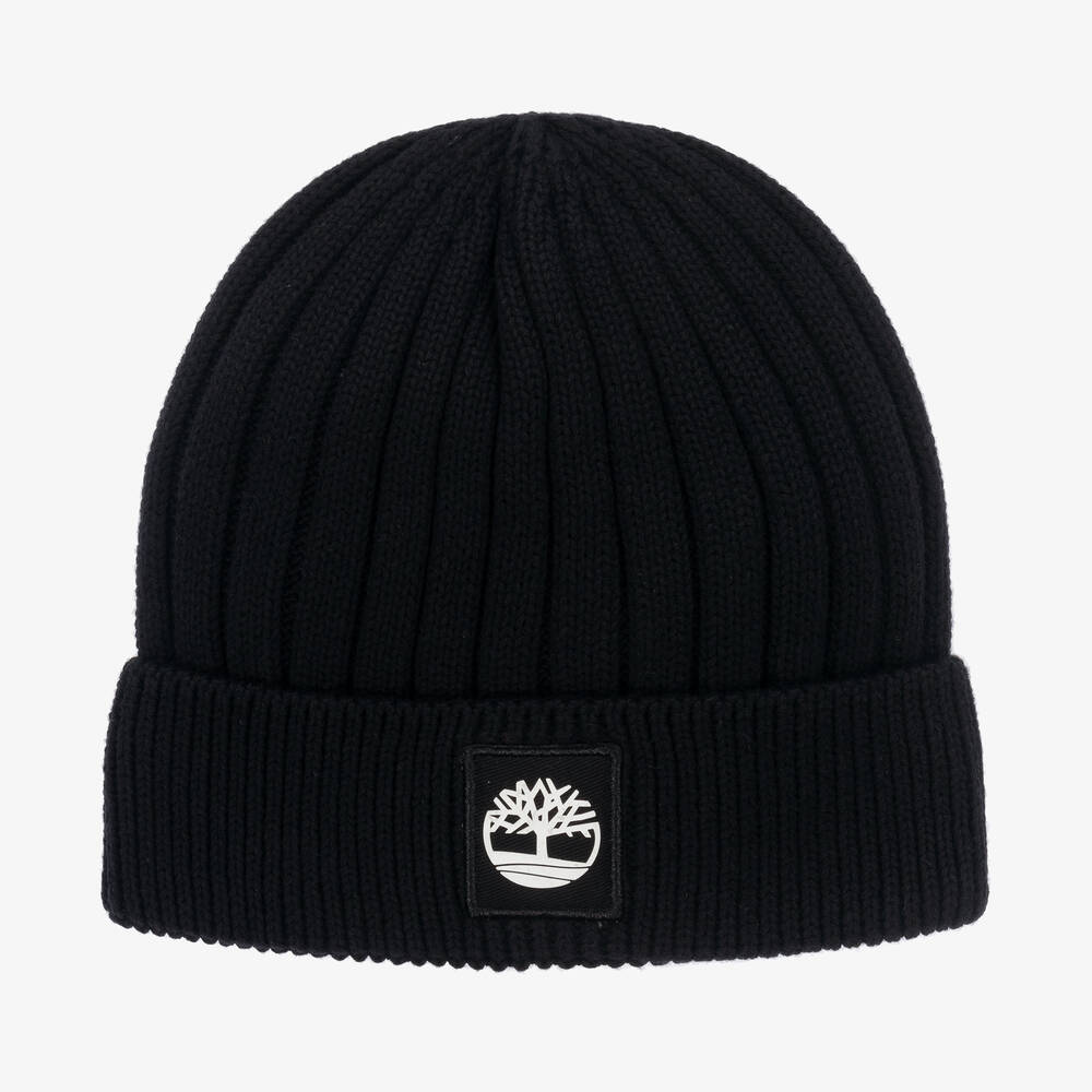 Black beanie hat for boys by Timberland, made in a chunky, ribbed cotton knit. Warm and cosy, it has a turned-up brim, with the brand's iconic white rubberised tree logo on a black patch on the front.