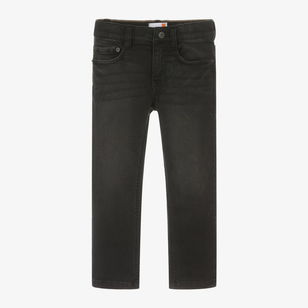 Black jeans for boys by American brand Timberland, made in comfortable stretch denim, with a cool, washed and worn look. Designed in a slim fit, they have classic five-pocket styling, with a logo patch sewn on the back. They fasten with a branded popper and zip and for an ideal fit and smaller sizes have an adjustable waistband.
