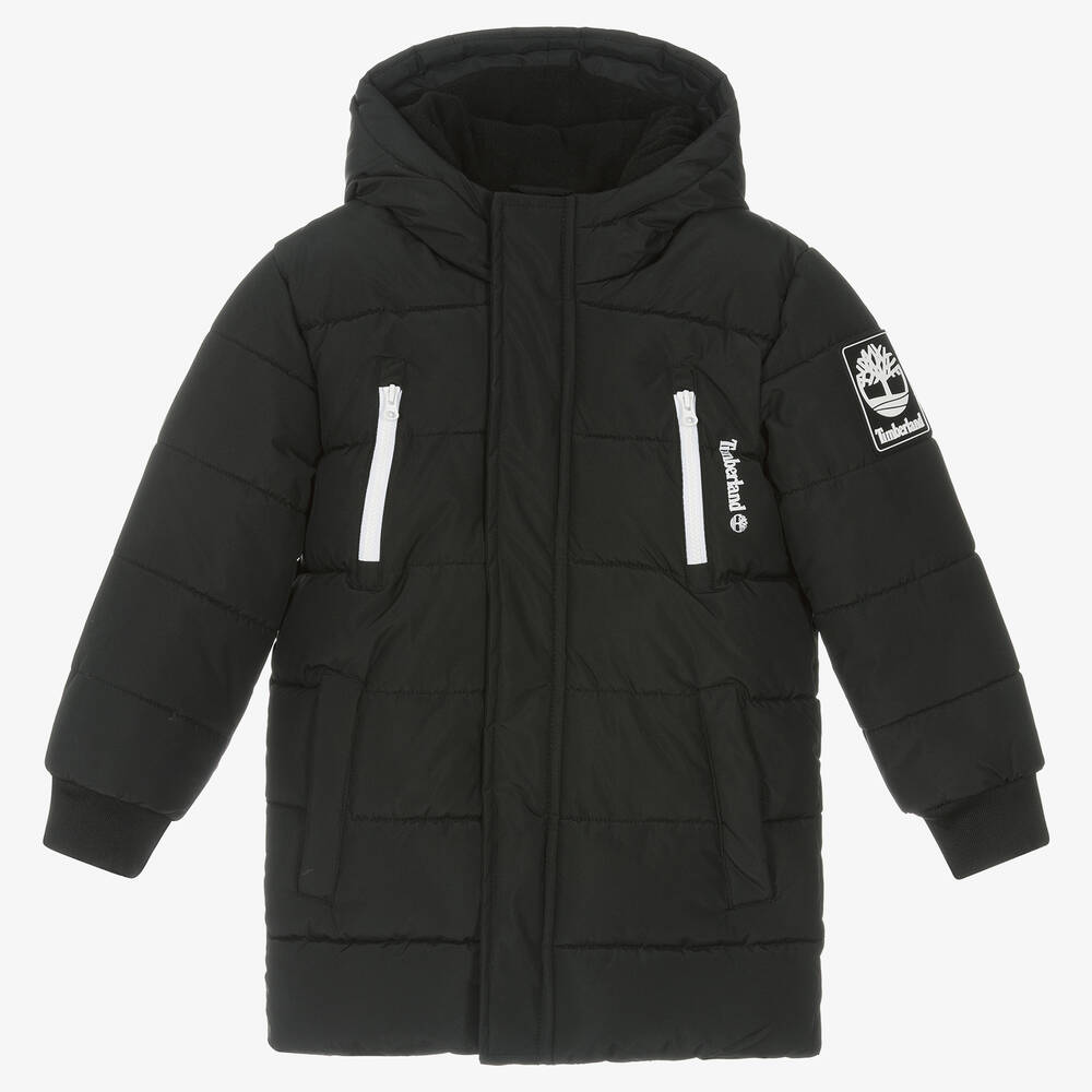 A black water-repellent puffer coat for boys by Timberland, made in a smooth matte fabric. This functional coat has side seam and zip-up pockets, with a signature logo printed on the front. Fastening with a zip and velcro placket, the hood, pockets and bodice are fleece-lined for warmth.