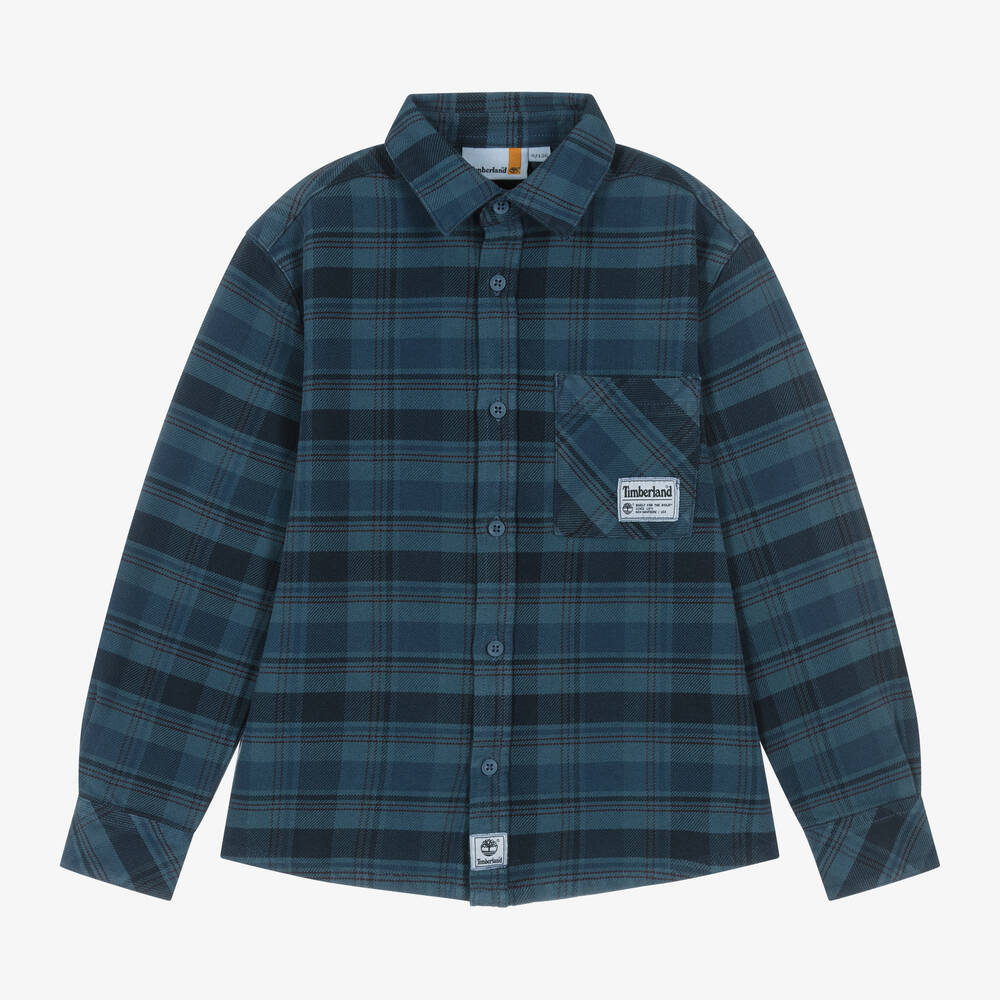 Checked shirt in shades of blue for boys by American brand Timberland. Made in mid-weight cotton twill, it has a patch pocket on the front, with the signature tree logo badge. It has long sleeves and fastens with branded buttons on the front and cuffs.