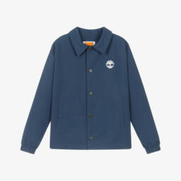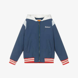 Cool navy blue and ivory colourblock zip-up jacket for boys by Timberland, designed with varsity-style striped trims. Smooth and lightly padded, this water-repellent layer has a button-on cotton jersey hood for added cosiness. It features an embroidered logo patch and front pockets with side slip access and branded poppers on the flap closure. Contains a majority of recycled polyamide.