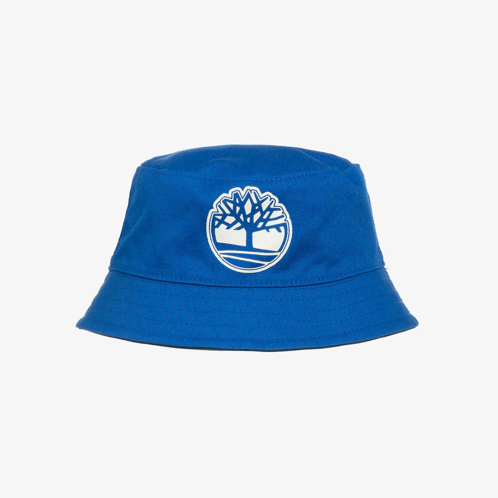 Two looks in one for younger boys with this reversible blue bucket hat by Timberland. Made in soft and durable cotton twill, one side is bright blue with a white tree logo whilst the other side is navy blue with ivory branding.
