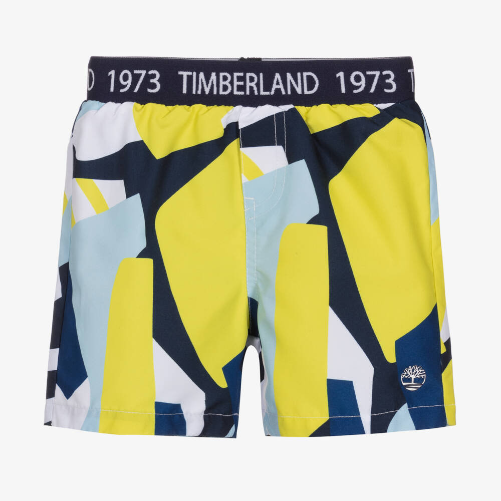 Blue, white and lime green swim shorts for boys, by Timberland. Bright and bold, these shorts are patterned in a cool abstract shape design. They are smooth and lightweight, with a stretchy logo jacquard waistband for easy pull-on wear. The brand's signature white logo can be seen on the hem.