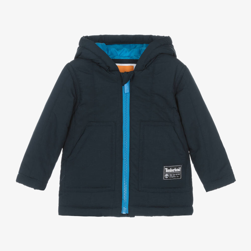 Navy blue hooded jacket for little boys by American brand Timberland. Ideal for wet weather, this water-repellent style is lightly padded for warmth and has front patch pockets, one with a logo patch. There is a protective chin guard on the contrasting light blue zip fastening and a coordinating light blue satin lining for comfort. The coat comes with a useful storage bag that fastens with poppers.