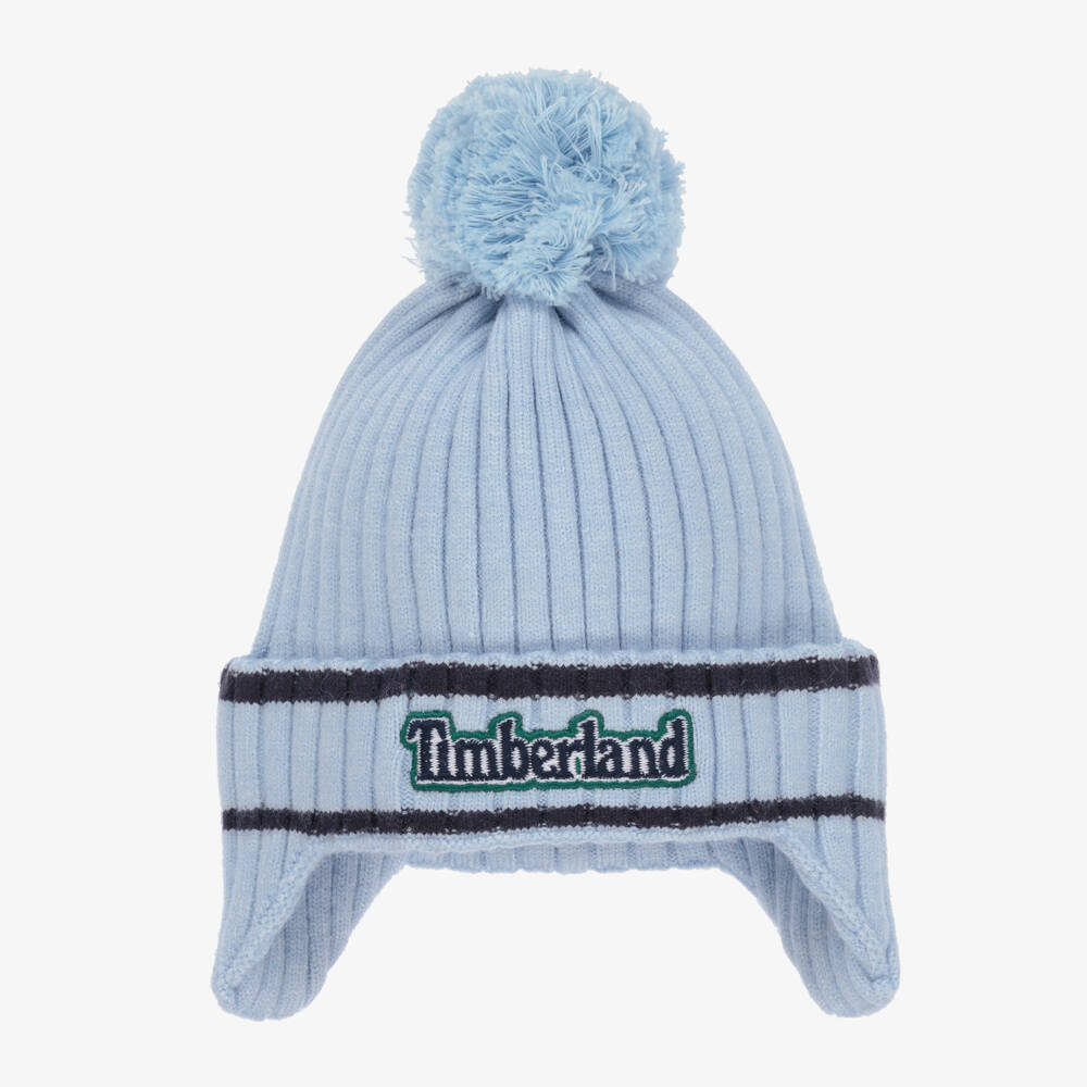 Cute pale blue knitted hat for baby boys from Timberland. Made in a beautifully soft viscose blend, with a ribbed pattern, it has an embroidered navy blue logo on the front. Cosy and comfortable, it is shaped to protect the ears and has a fun pom-pom on the top,