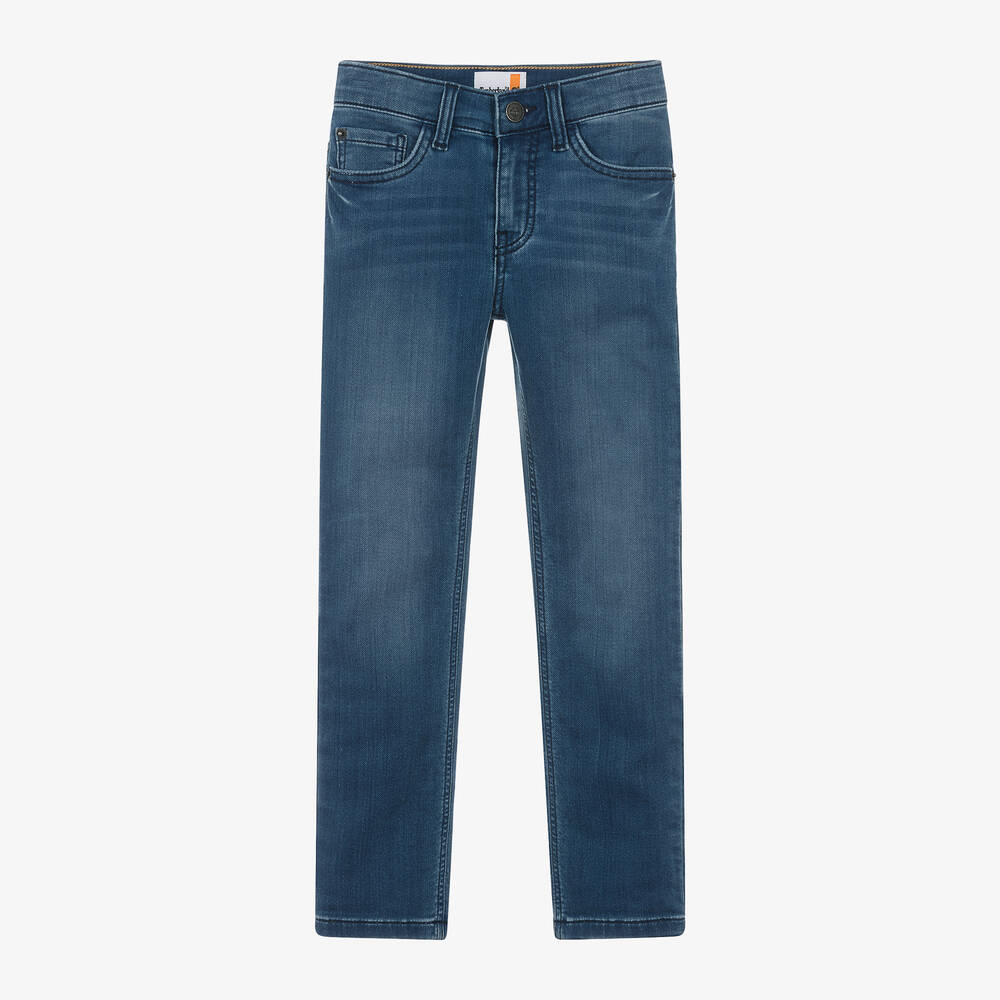 Blue jeans for boys by American designer Timberland, made in comfortable, cotton jersey denim with a washed and worn look. A classic five-pocket style, they have an adjustable waistband on smaller sizes for a good fit. They fasten with a branded button and a zip on the front and have a logo patch around the back.