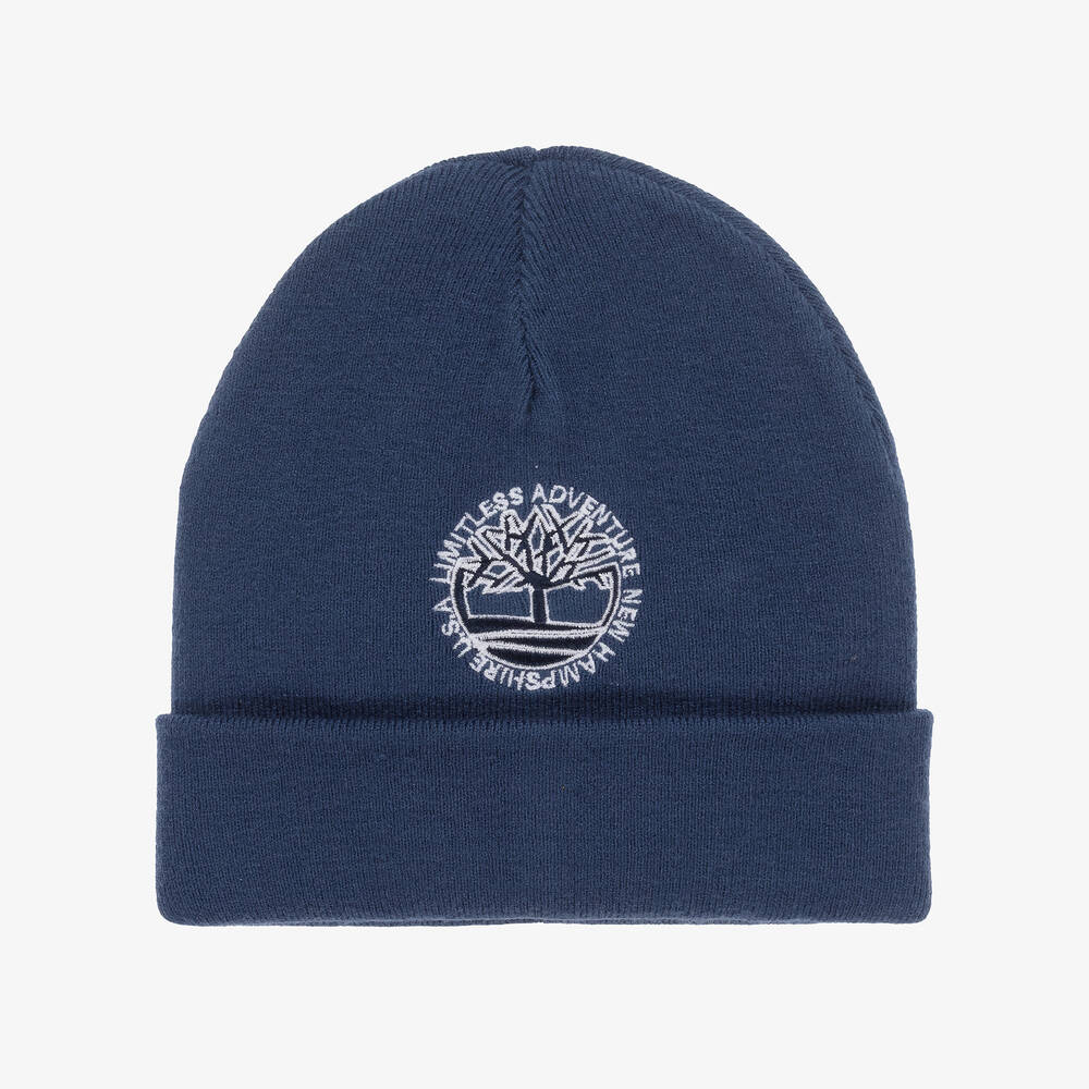 Blue beanie hat for boys by Timberland, knitted in a super soft viscose blend. Cosy and comfortable to wear, this double layer hat has a turned-up brim and the brand's signature tree and logo embroidered on the front in navy blue and white for a statement finish.