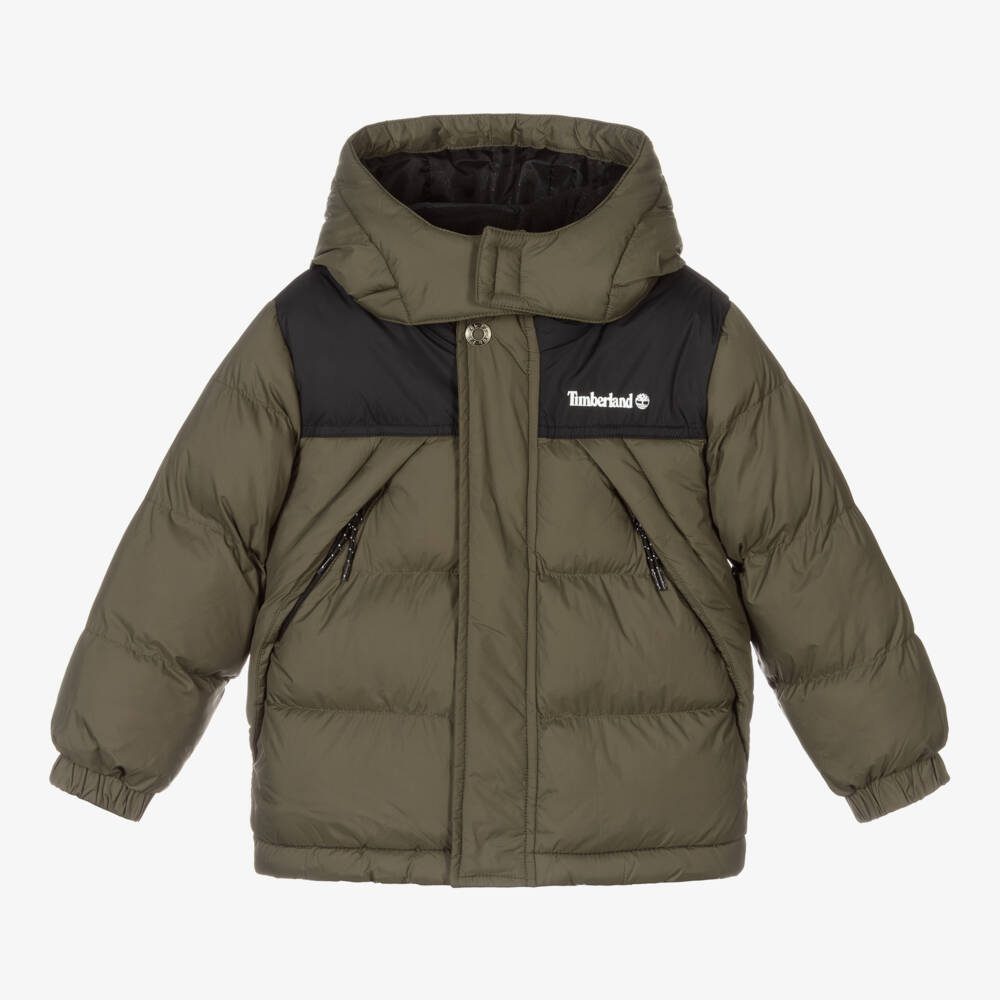 Khaki green puffer jacket for boys by Timberland. Made with water repellent polyamide, it has the brand's logo printed on the front in white, featuring the signature tree logo. With mid-weight padding, it has contrast black front pocket trims, a detachable hood with a zip fastening, and cosy fleece lining on the neck for warmth.