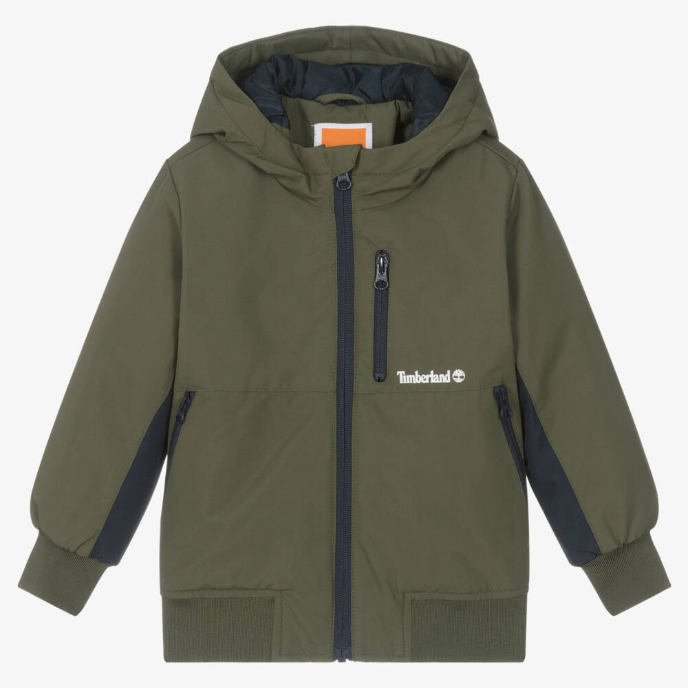 A khaki green hooded jacket for boys by Timberland, made in a smooth water-repellent fabric. Cool yet functional, this jacket has zip-up pockets, navy blue trims and a white logo print. It fastens with a zip and is comfortably finished with ribbed hems.