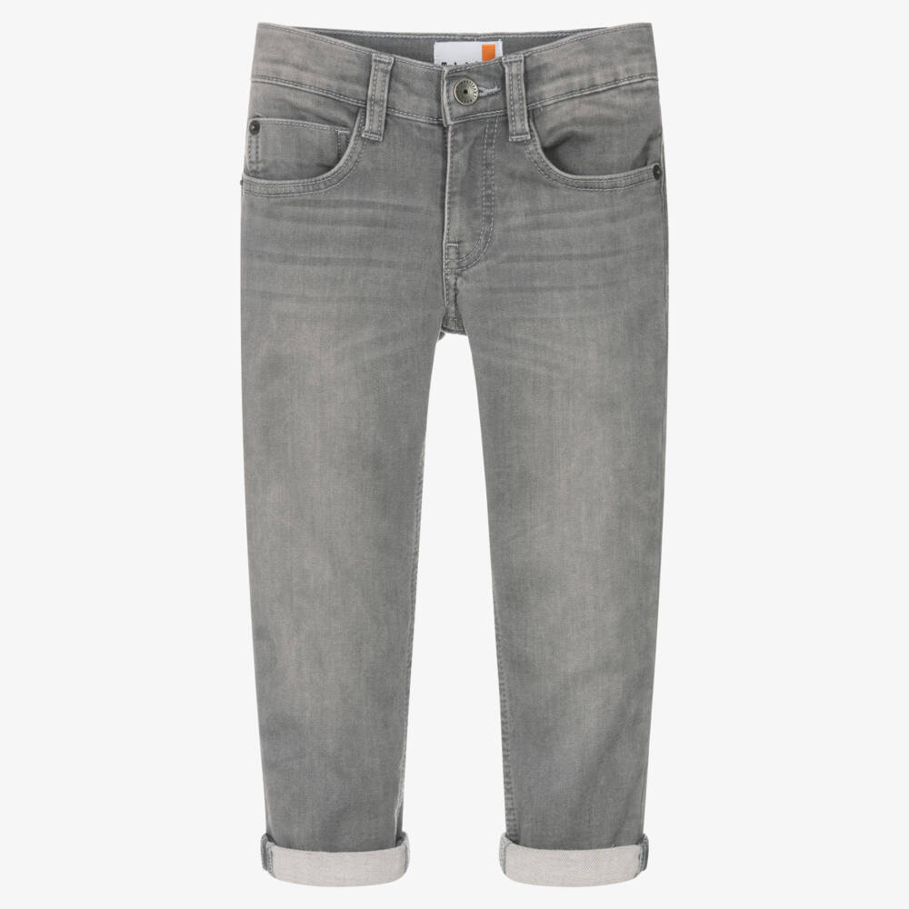 Grey jeans for boys by Timberland, made in soft denim with a slight stretch for comfort. Designed in a cool slim fit, they have classic five-pocket styling and an adjustable waistband for a good fit. For designer appeal, a branded logo patch is on one back pocket.