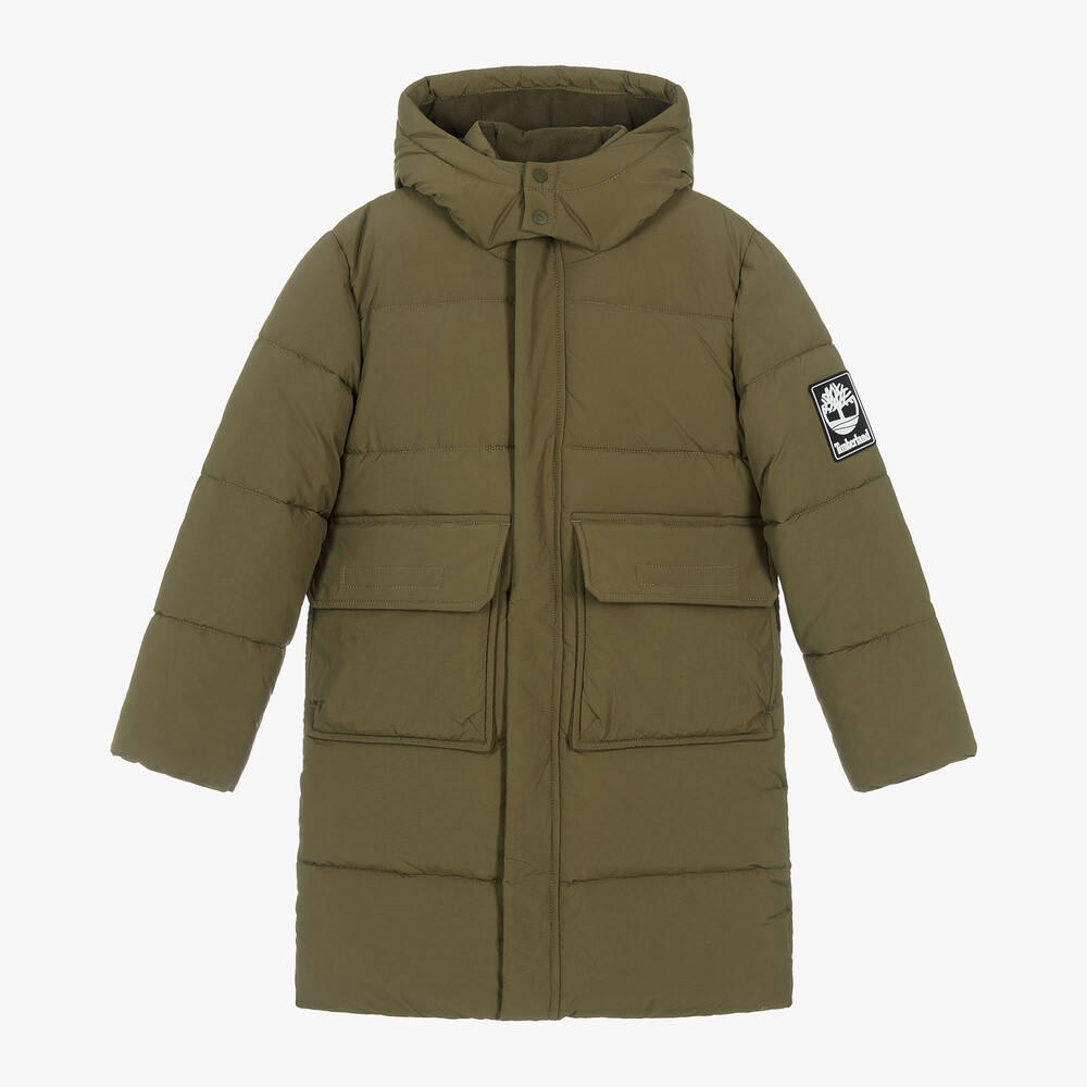 Warm and cosy, a khaki green hooded puffer coat for boys by American brand Timberland, just right for cooler days. With mid-weight padding, it has a stand-up collar and poppers to close the fleece-lined hood around the neckline for extra cosiness. There is a protective, popper-fastening flap over the front zip and internal, elasticated cuffs. The front velcro-fastening patch pockets have additional, fleece-lined side pockets to keep hands out of the cold. This water repellent coat is lined in yellow satin for comfort. For instant brand recognition, there is a rubberised logo badge on one sleeve and a black logo printed across the back.