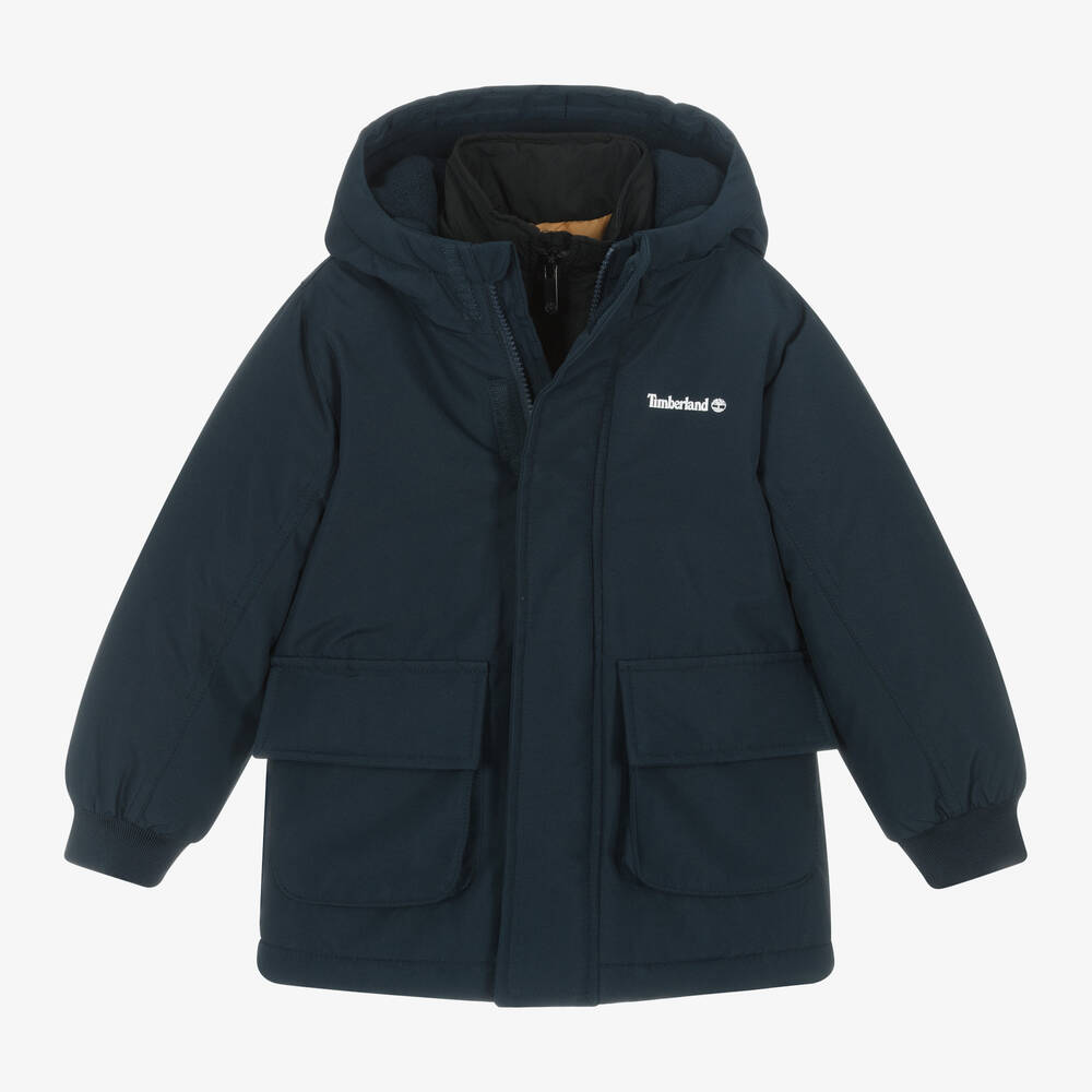 A practical, 3-in1, parka coat set for boys by American brand, Timberland. The waterproof, navy blue hooded parka coat is warmly padded and lined in soft fleece. It fastens with a zip beneath a velcro storm flap, with cosy ribbed cuffs and fleece-lined flap pockets for added comfort. It comes with a lighter-weight black, water-repellent jacket that has a stand-up collar and concealed side seam pockets. Both items have a white logo print on the chest for instant designer appeal. These pieces are designed to be worn separately, but can also be attached at the cuffs to create a super warm layer for colder days.
