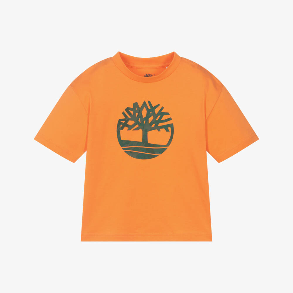Orange T-shirt for boys by Timberland, made in super soft organic cotton jersey for everyday comfort. This short-sleeved tee features a cool, textured camouflage print of the iconic Tree logo in green and brown.